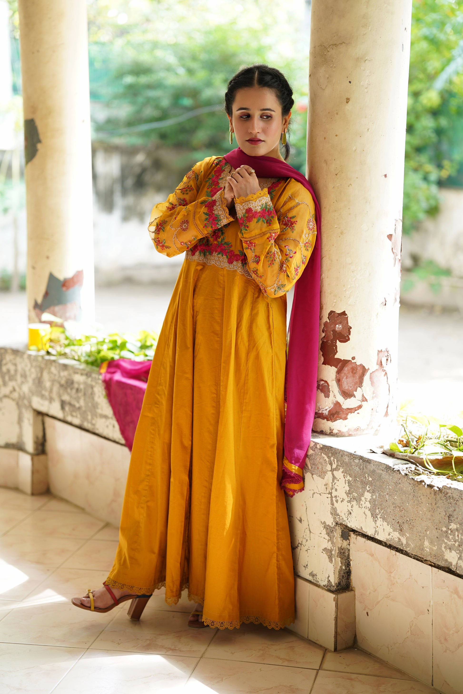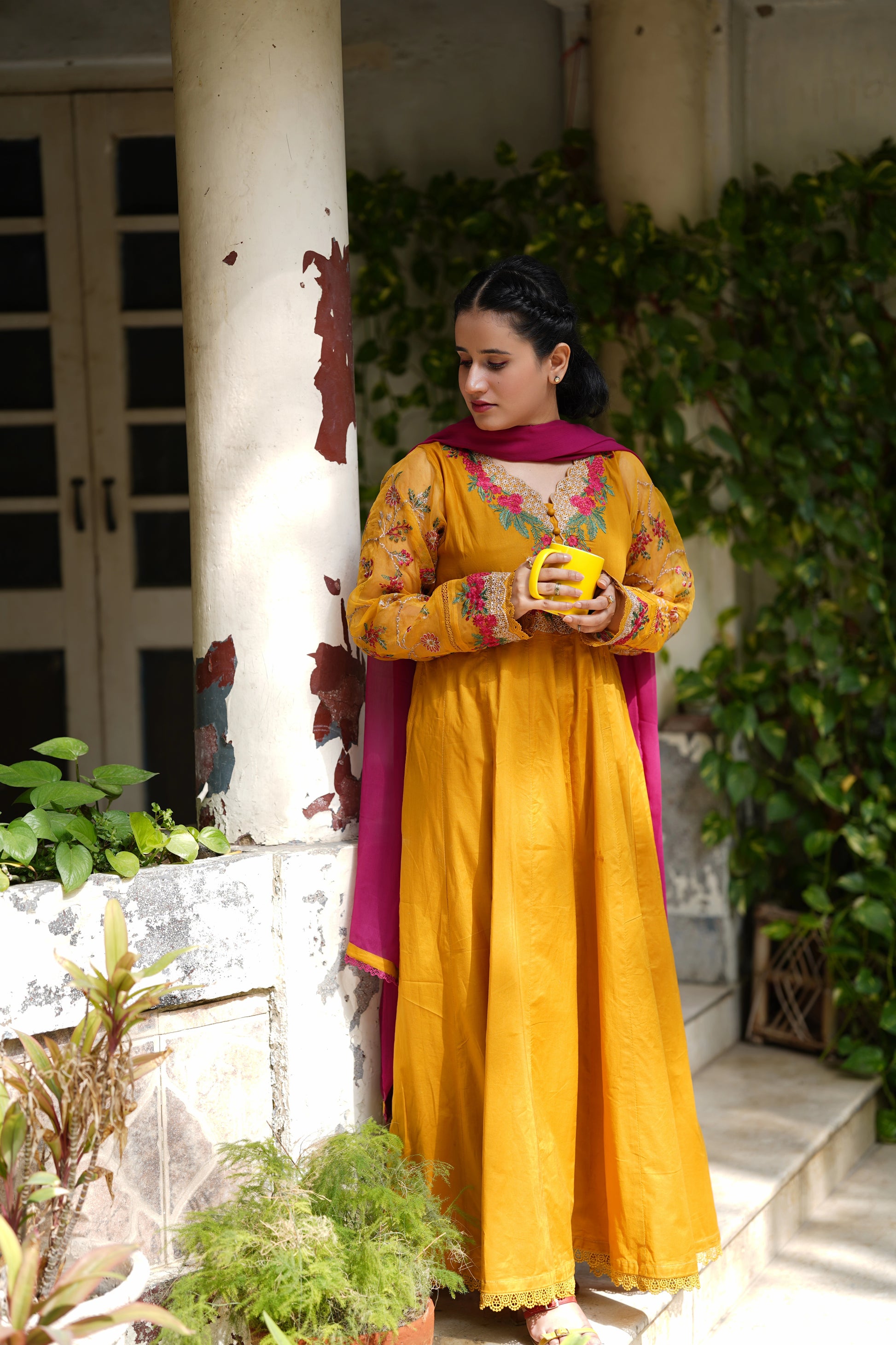 Mustard gold embroidered frock 3pcs
